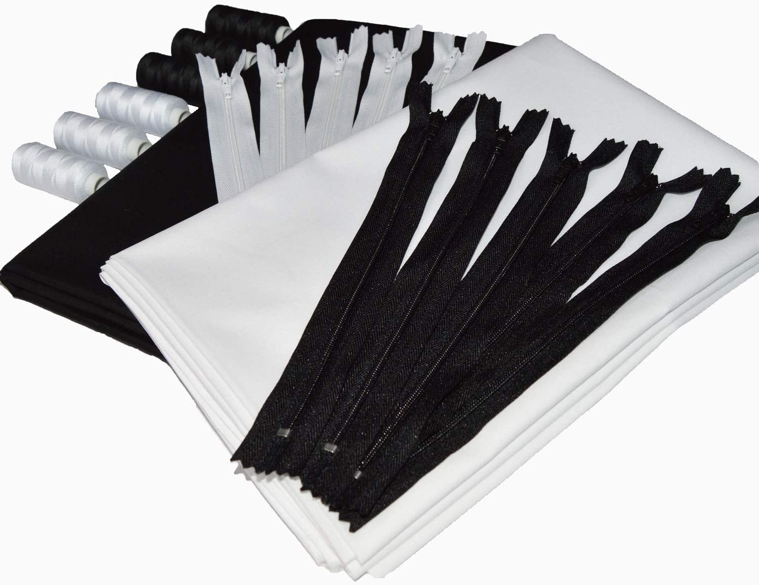 - Lot de 2 coupons tissu popeline de coton blanc et noir (1m x 1m46 chacun) + 5 zips de 20cm de long blancs, 5 zips nylon de 20cm de long noirs, 3 bobines de fil blanc et 3 bobines de fil noir (400m de fil par bobine)
