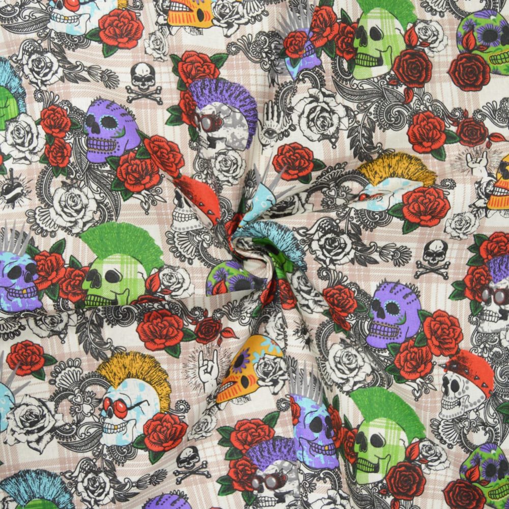 Tissu coton imprimé skull écossais beige vendu par coupon de 50cm ou 1m (Largeur 1m60)